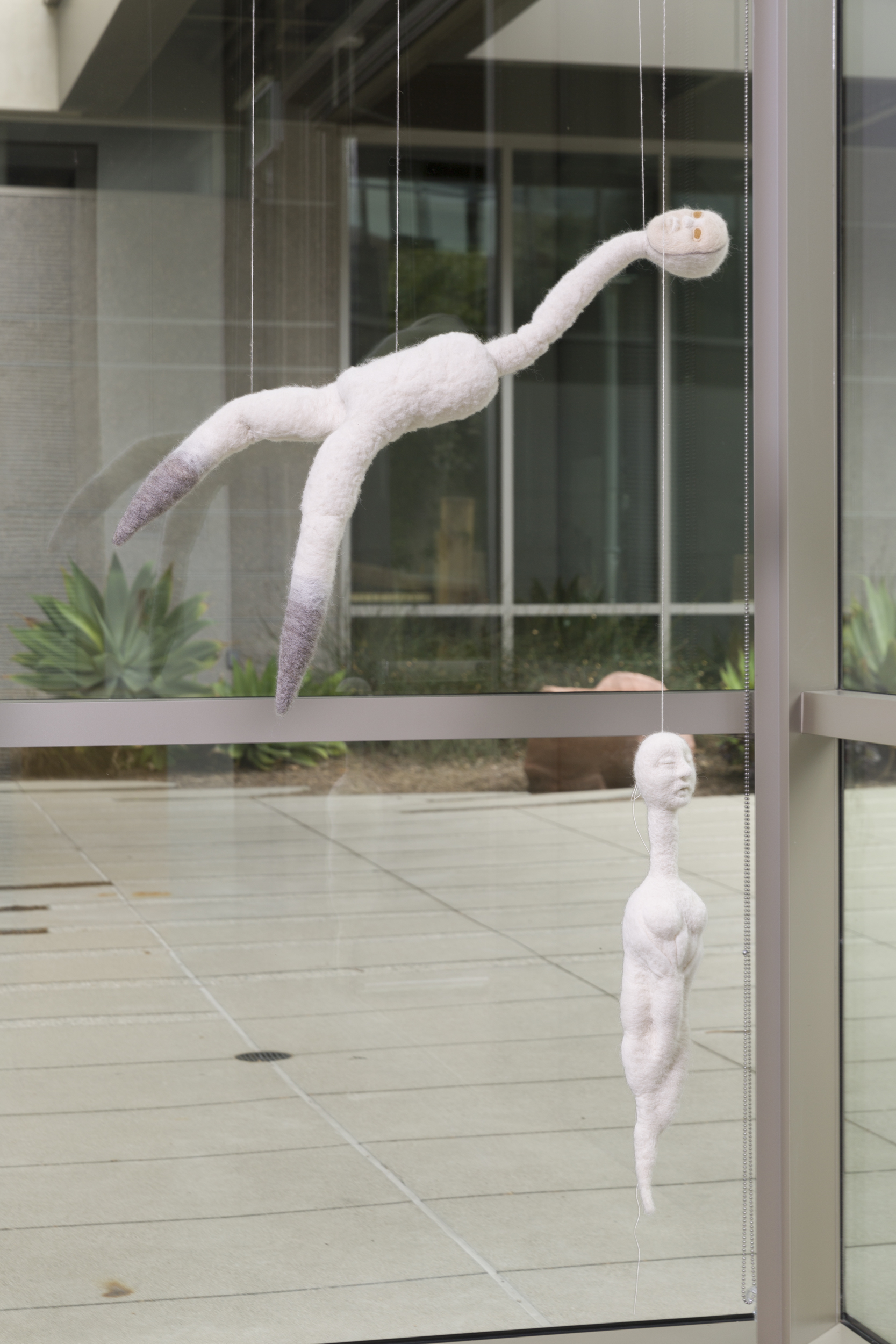 The materials I work with remind me of the physical experience of being. The watercolor paint is like my bodily fluids, while wool is a fiber not so different from my own hair. I pour paint onto the paper with force and it splatters in undesirable places, reminding me of a jet of urine splashing against the ground and onto my shoe. Piss, blood, saliva, cum: unwieldy things made wieldy. I root wool into the surface, changing the object, allowing paper to become skin.