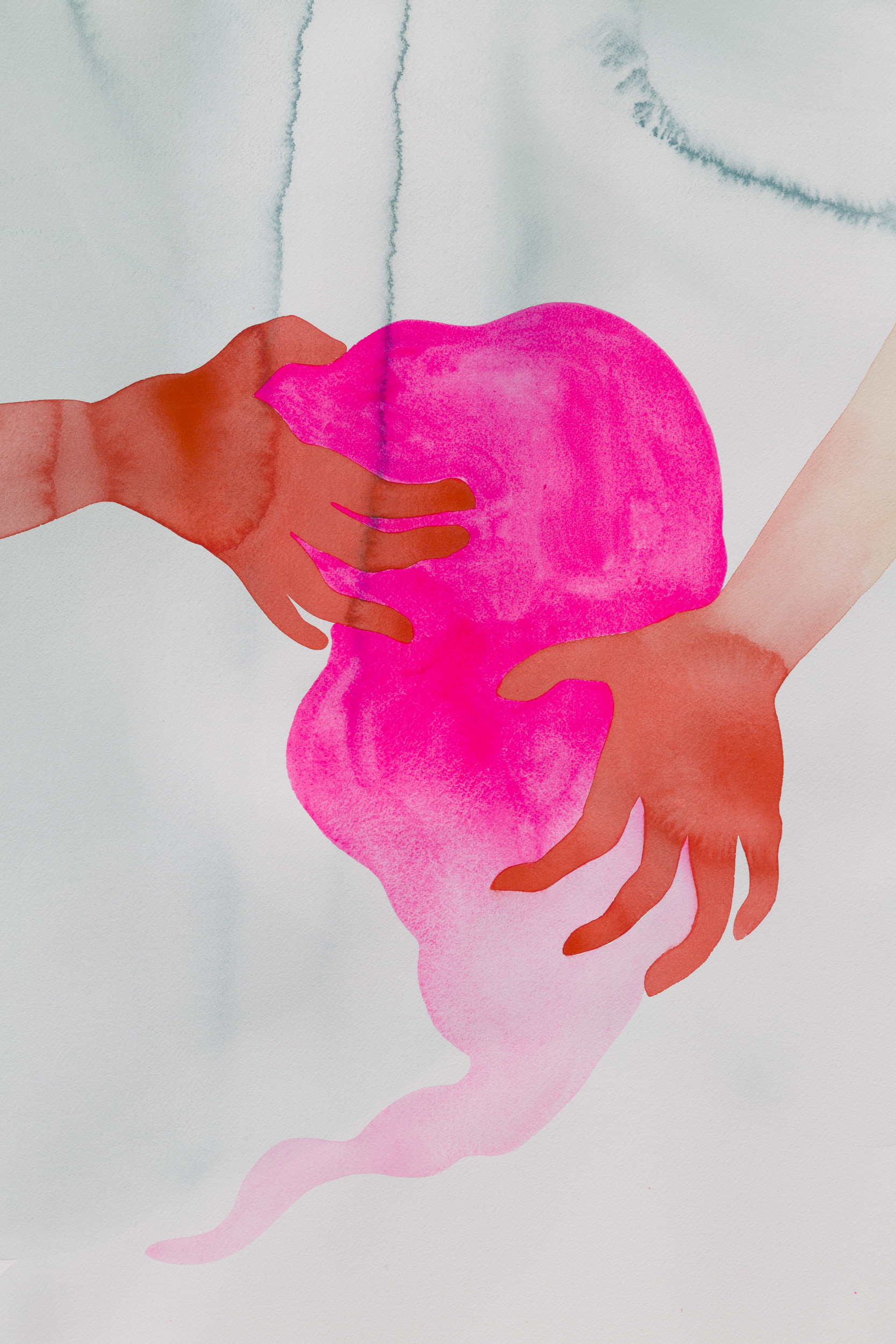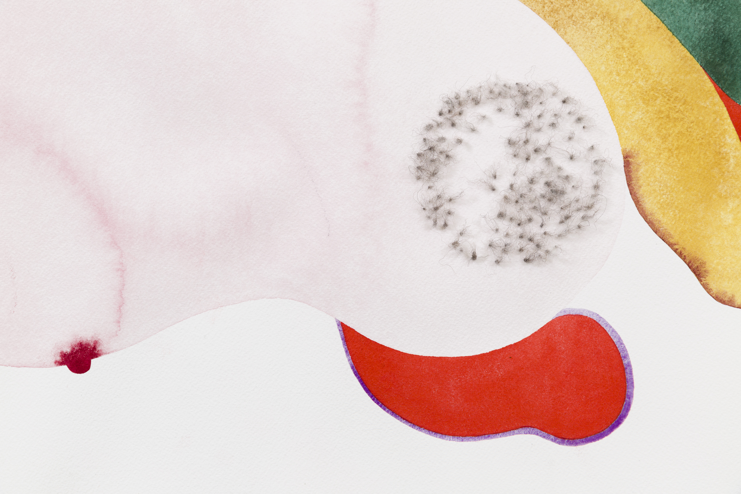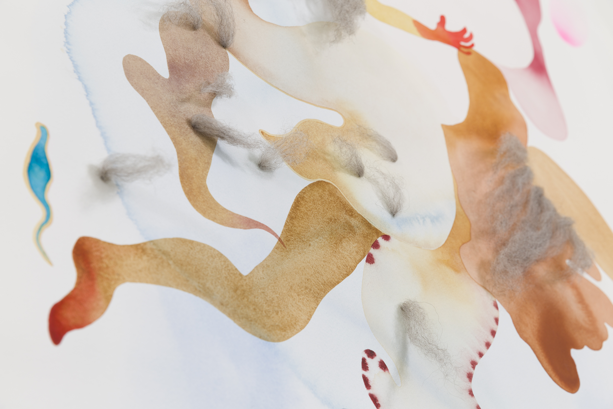 works on cotton paper in watercolor, acrylic, graphite, and wool on cotton paper